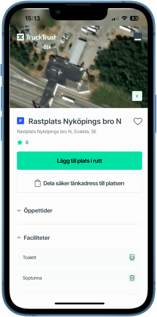 Appen planerar din rutt utefter ditt ekipage storlek (OBS! Följ alltid skyltangivelserna på vägen) och du hittar de offentliga lastbilsparkeringarna utmärkta i vår karta. Givetvis ingår du i vårt community och kommer att få nyhetsbrev och annan matnyttig info som hjälper dig på vägarna.
